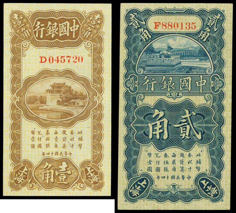 Bank of China, 10 cents and 20 cents, 1925, Shanghai, serial number D 045720, F 880135, brown on yellow on obverse of 10 cents, house by lakeside at centre, reverse blue, the 20 cents blue on yellow, monument of bull at top centre, reverse brown,