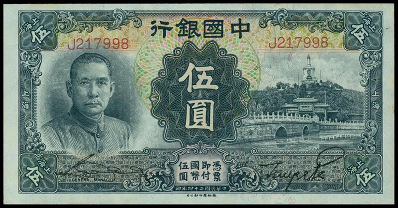 Bank of China, 5 Yuan, 1935, red serial number J217998, black on multicolour underprint, Sun Yat Sen at left, bridge to pagoda at right, reverse green on yellow underprint, building Sp at centre,