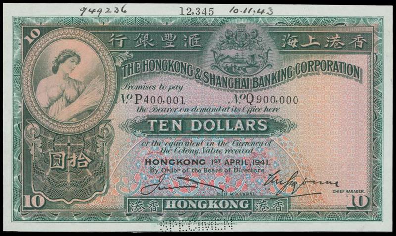 Hong Kong and Shanghai Banking Corporation, Hong Kong, specimen $10, 1 April 1941, serial number P 400001-Q 900000, blue-green and pink, Ceres top left, arms top centre right and at left and right, Grayburn signature low right, reverse blue-green, bank building and angel at centre, value at left and right