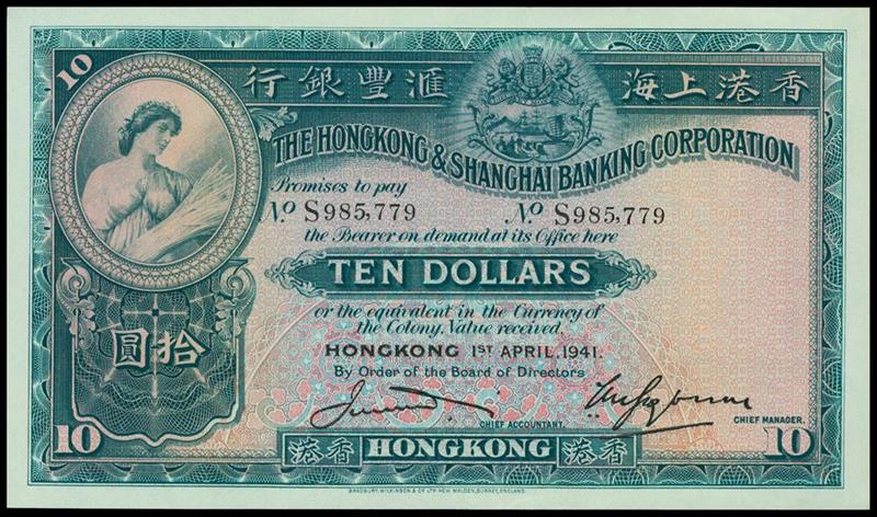Hong Kong and Shanghai Banking Corporation, $10, 1 April 1941, serial number S985779, green and multicolour underprint, Ceres top left, arms at top right centre, two printed signatures below, reverse green and multicoloured, bank building at centre with an angel and trumpet above, value at left and right