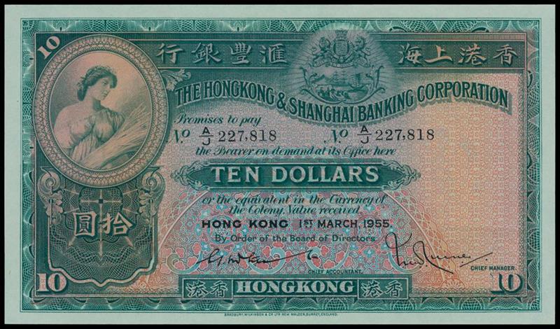 Hong Kong and Shanghai Banking Corporation, $10, 1 March 1955, serial number A/J 227818, green and multicolour underprint, Ceres top left, arms at top right centre, two printed signatures below, reverse green and multicoloured, bank building at centre with an angel and trumpet above, value at left and right