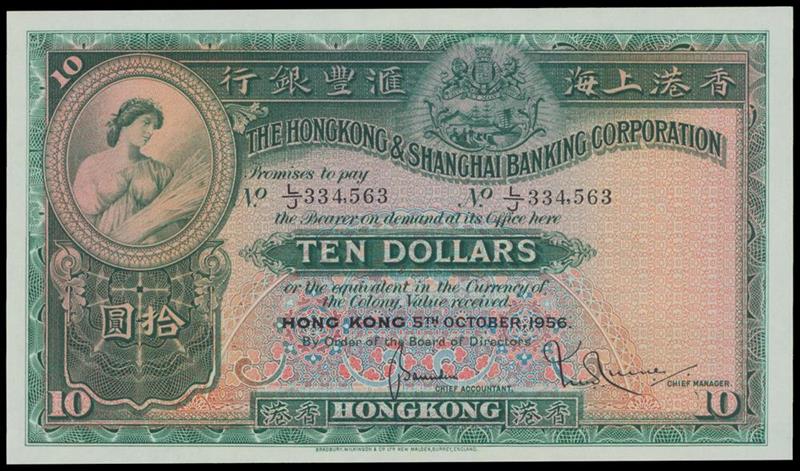Hong Kong and Shanghai Banking Corporation, $10, 5 October 1956, serial number L/J 334563, green on multicolour underprint, maiden and arms at left, watermark at right, reverse green, bank building at centre,
