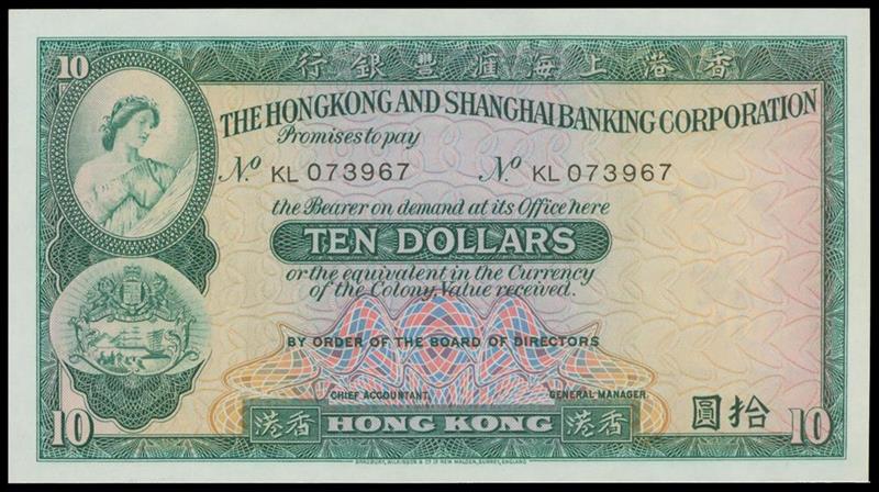 Hong Kong and Shanghai Banking Corporation, $10, error of date and signatures omitted, serial number KL 073967, green on multicoloured underprint, maiden and arms at left, reverse green, old bank building at centre,