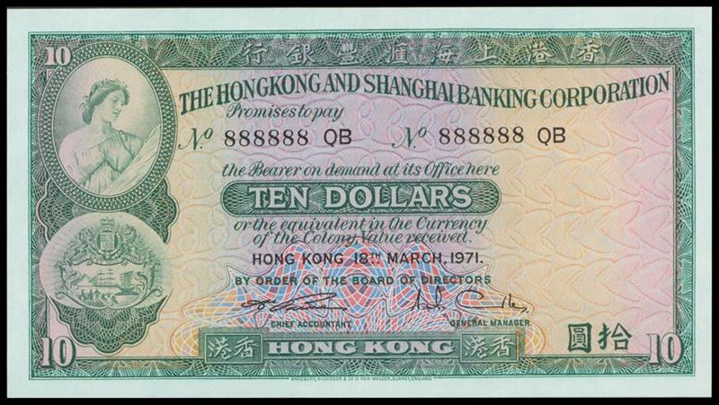 Hong Kong & Shanghai Banking Corporation, $10, 18 March 1971, solid serial number 888888 QB, green on multicoloured underprint, Ceres at top left, coat of arms at bottom left, printed signatures, reverse green and multicolour, old bank building at centre,