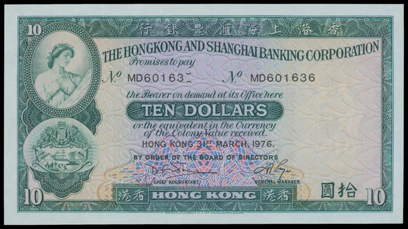 Hong Kong and Shanghai Banking Corporation, $10, 31 March 1976, serial number MD 601636, error note, with part of serial number on the left missing or faded due to a misprint,