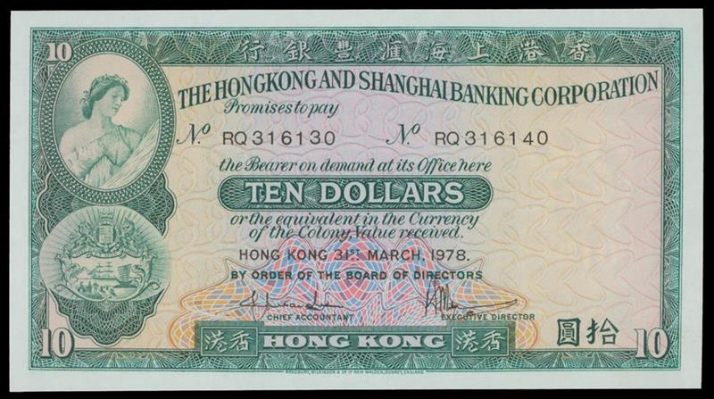 The HongKong and Shanghai Banking Corporation, $10, 1978, error mismatched serial numbers RQ316130/RQ316140, green on light pink, Ceres top left, coat of arms at bottom, the reverse shows the old HSBC building,