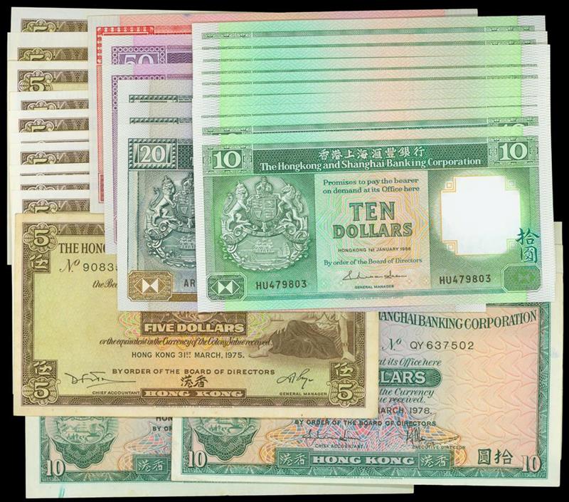 The HongKong and Shanghai Banking Corporation, lot f 31 notes from the 1970's to 1980's, $5, $10, $20, $50 and $100 denominations, most notes uncirculated (31).