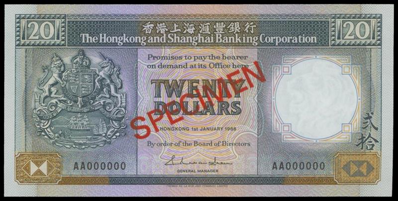 Hong Kong & Shanghai Banking Corporation, $20, 'Specimen', 1986, serial number AA 000000, blue-gray on multicoloured underprint, arms at left, reverse blue-gray and multicolour, lions flanking bank buiding at centre,