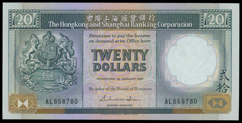 Hong Kong and Shanghai Banking Corporation, , $20, 1 Jan 1987, 'Key date', serial number AL 858780, blue-gray on multicolour underprint, coat of arms at left, watermark at right, reverse blue-gray and multicolour, two lions flanking the bank building,
