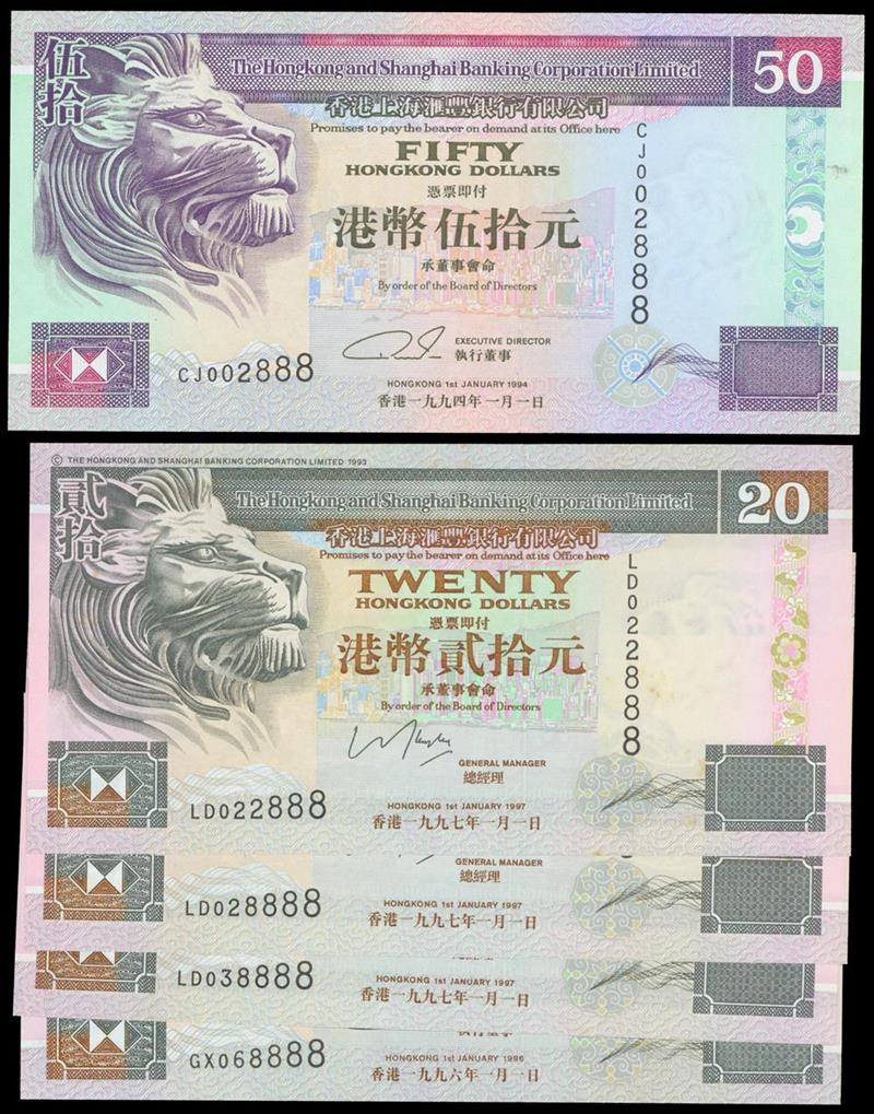 The HongKong and Shanghai Banking Corporation, lot of 5 notes, consisting of 4x $20 and 1x $50, semi lucky serial numbers GX068888, LD038888, LD028888, LD022888 and CJ002888, (Pick 201 and 202 for types), all uncirculated (5).
