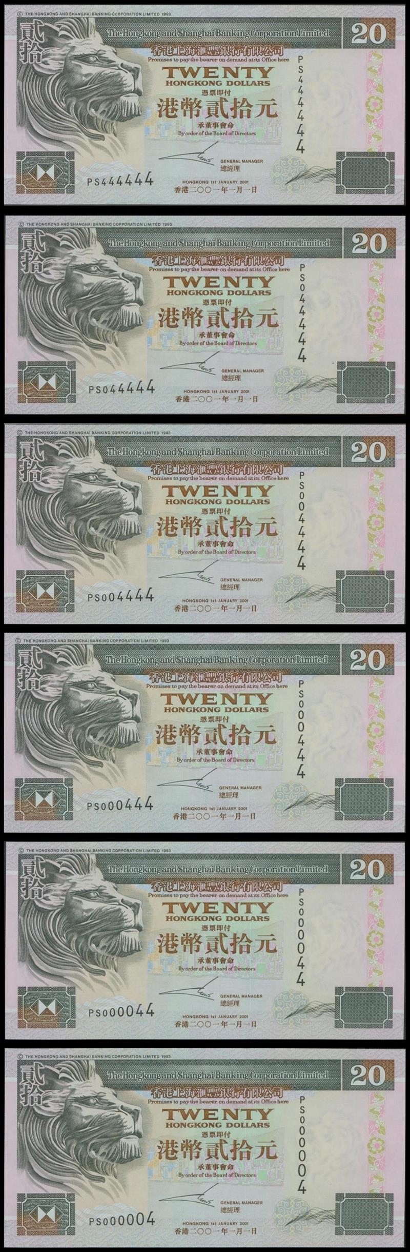 Hong Kong and Shanghai Banking Corporation, $20, 1 January 2001, a lot of 6 semi-lucky number with same prefix PS, 000004, 000044, 000444, 004444, 044444, 444444, all in PMG holder 66 EPQ, gem uncirculated.(6)