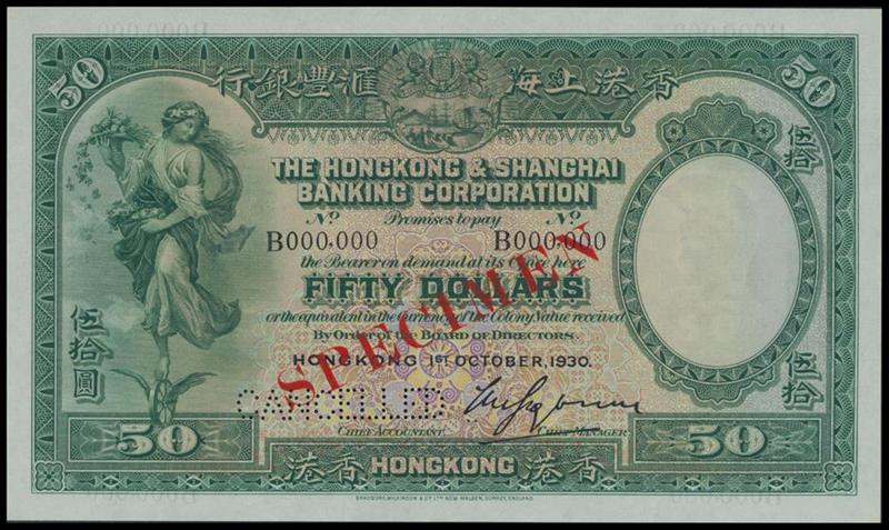 The HongKong and Shanghai Banking Corporation, $50, 'Specimen', 1930, serial number B000000, dark green on multicoloured underprint, Communication on flying wheel, watermark of a helmeted warrior at right, reverse green, old HSBC below an angel playing a trumpet,