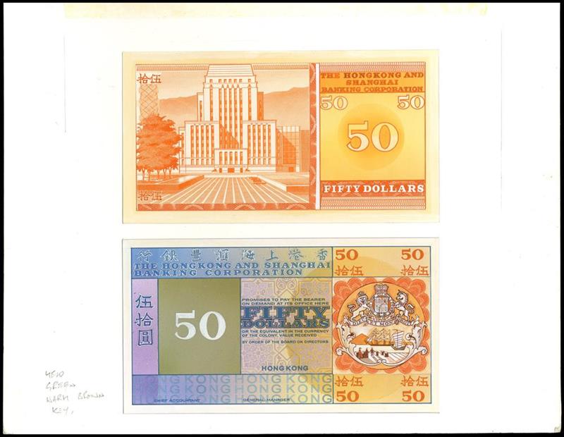 Hong Kong and Shanghai Banking Corporation, an obverse and reverse composite essay on board for a proposed issue of $50, ND (ca 1968), orange and multicoloured, arms at right, value at centre and at left and right, reverse orange and yellow, bank building at left, value at right
