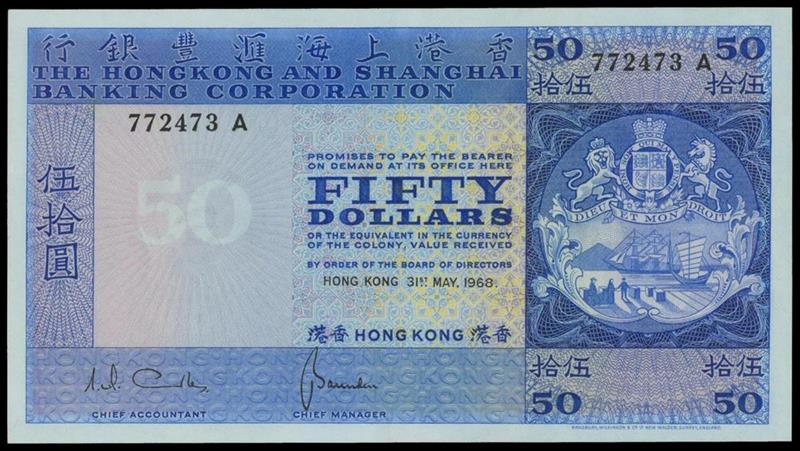 The HongKong and Shanghai Banking Corporation, $50, 1968, serial number 772473A, blue, coat of arms at right, watermark of a helmeted warrior at left, reverse blue, bank building at left, geometric design at right,
