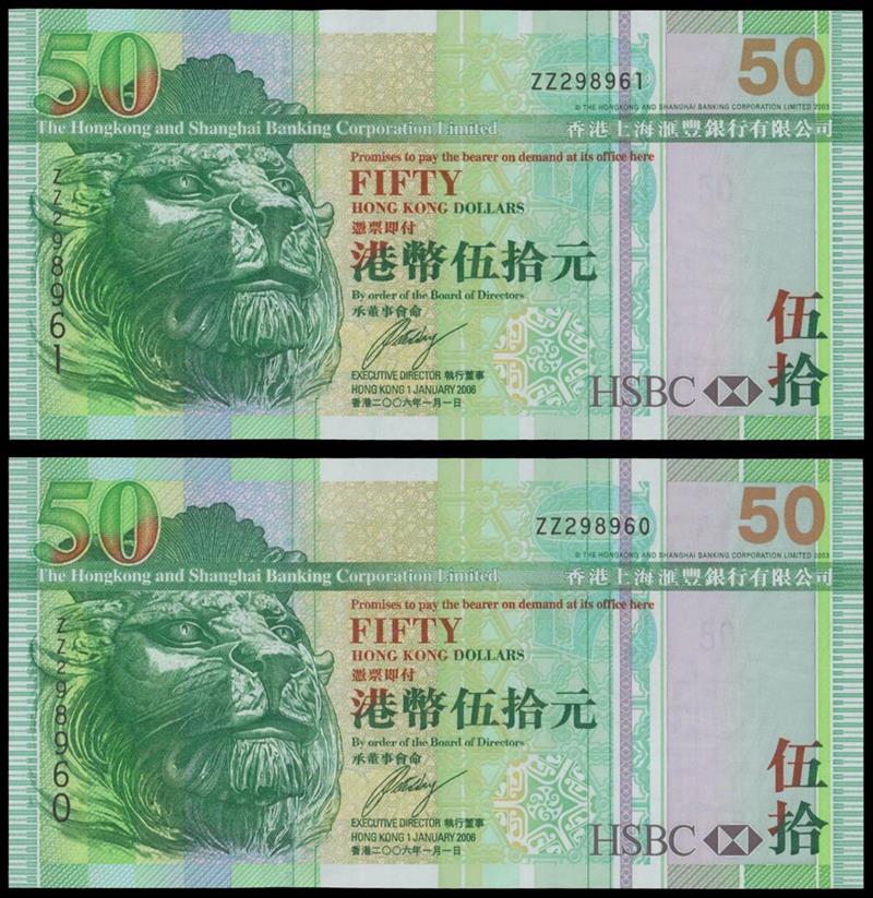 The HongKong and Shanghai Banking Corporation, pair of $50, 2006, replacement prefix ZZ298960 and 298961, green, lion at left,