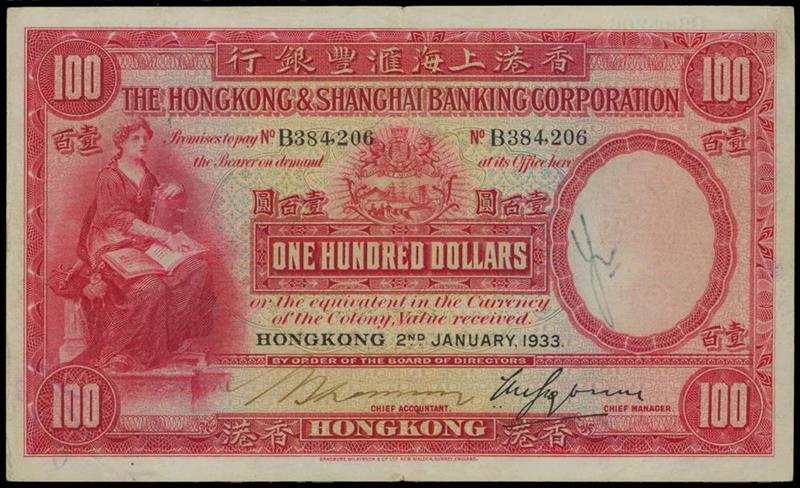 Hong Kong and Shanghai Banking Corporation, $100, 2 January 1933, serial number B384206, red on multicolour underprint, maiden at left, arms top centre, value at centre and each corner, manuscript signature at low left, printed signature low right, reverse red, bank building at centre, angel above, serial numbers at four corners,