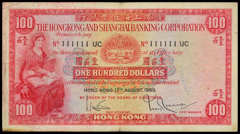 The HongKong and Shanghai Banking Corporation, $100, 1959, lucky serial number 111111 UC, red and multicoloured, 'Justicia' sitting with an open book at left, coat of arms top centre, watermark of helmeted warrior at right, reverse red, the old HSBC building at centre,