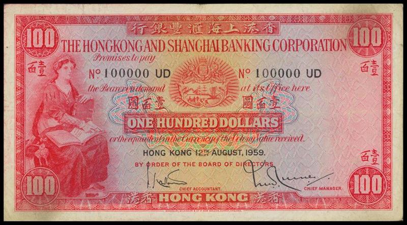 The HongKong and Shanghai Banking Corporation, $100, 1959, lucky number 100000 UD, red and multicoloured, 'Justicia' sitting with an open book at left, coat of arms top centre, watermark of helmeted warrior at right, reverse red, the old HSBC building at centre,