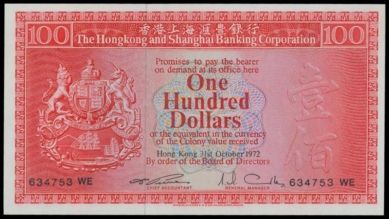 Hong Kong & Shanghai Banking Corporation, $100, 31 October 1972, serial number 634753 WE, red and multicolour, arms at left, value and watermark at right, reverse red and multicoloured underprint, old bank building at centre, two lions left and right,