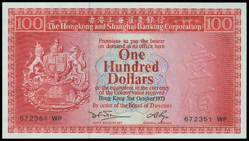 Hong Kong & Shanghai Banking Corporation, $100, 31 October 1973, serial number 672351 WP, red and multicolour, arms at left, value and watermark at right, reverse red and multicoloured underprint, old bank building at centre, two lions left and right,