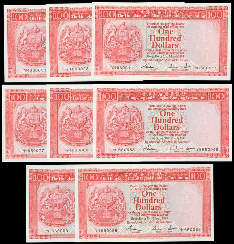 The HongKong and Shanghai Banking Corporation, group of 8x $100, 1983, semi lucky numbers, YH660011, 22, 33, 55, 66, 77, 88, 99, red with multicoloured vignette at centre, coat of arms at left, watermark of lion at right, reverse red, green and multicoloured, two lions flanking the HSBC building,