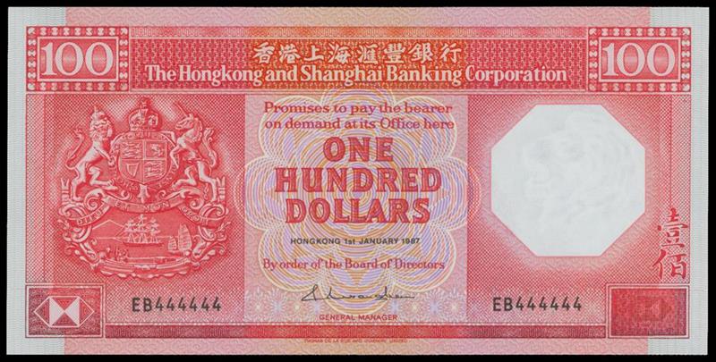 The HongKong and Shanghai Banking Corporation, $100, 1987, lucky serial number EB777777, deep red, coat of arms at left, hexagonal watermark area at right, reverse red, HSBC building and lions at centre,