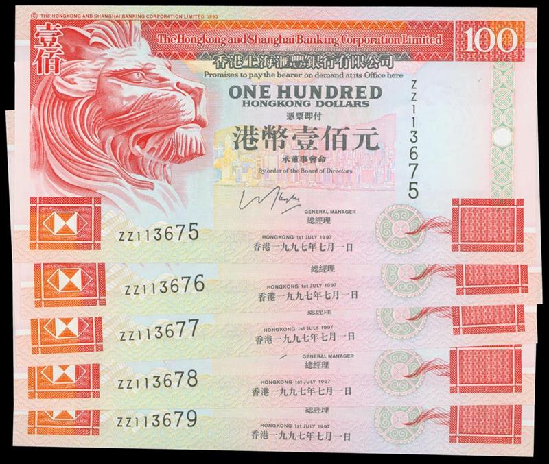 The HongKong and Shanghai Banking Corporation, consecutive run of 5x $100, 1997, replacement prefix ZZ113675-679, red and multicoloured, lion profile at left, view of Hong Kong Island at centre,