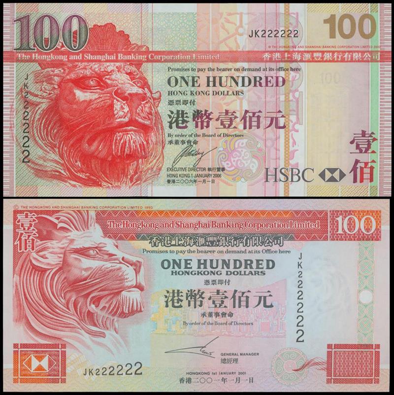 The HongKong and Shanghai Banking Corporation, pair of $100, 2001 and 2006, both with the same lucky serial number JK222222, (Pick 203d and 209c), PMG 66EPQ and 65EPQ respectively (2).