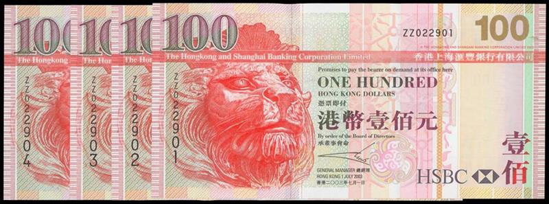 The HongKong and Shanghai Banking Corporation, consecutive run of 4x $100, 2003, replacement serial numbers ZZ022901-904, red and multicoloured, lion at left, Tsing Ma Bridge on reverse,