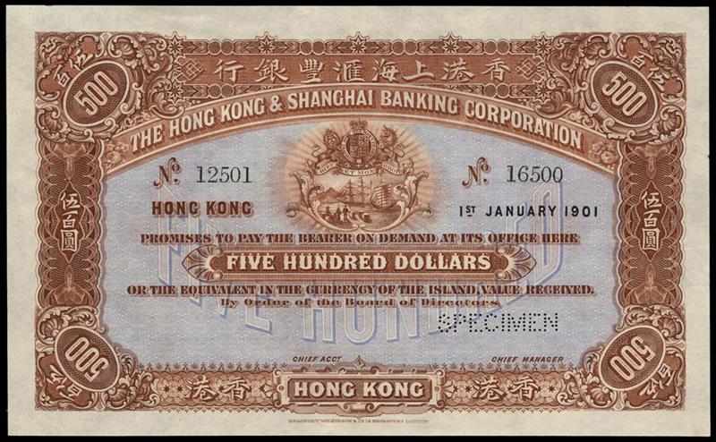 Hong Kong and Shanghai Banking Corporation, Hong Kong, specimen $500, 1 January 1901, serial number 12501-16500, brown and pale blue, arms top centre value in curved underprint low centre, value at centre and value at each corner, reverse red, maiden spinning (Industry) with cherubs at centre, value at each corner