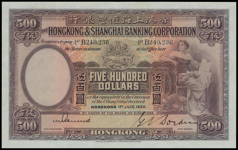 The HongKong and Shanghai Banking Corporation, $500, 1930, serial number B240236, dark brown on purple and multicoloured underprint, woman seated holding tablet at right, coat of arms top centre, reverse purple and yellow brown, angel playing trumpet above HSBC building,