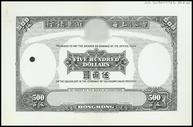 The HongKong and Shanghai Banking Corporation, $500, uniface 'partial proof' of the obverse, dated 25.8.65, in pen, black and white,depicting the underprint of the note only, the note comes with the original envelop from the printer's,