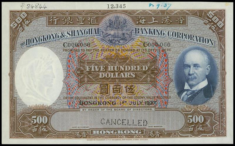 The HongKong and Shanghai Banking Corporation, $500, 'specimen proof', 1937, brown and multicoloured, Sir Thomas Jackson at right, coat of arms top centre and watermark of a woman at left, perforated 'CANCELLED' bottom centre, reverse blue, old HSBC building at centre,