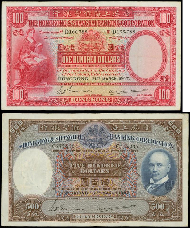 Hong Kong and Shanghai Banking Corporation, mixed lot of $100 and $500, 31 March 1947, serial number D166788 and C775235, red on multicoloured underprint and brown on blue,
