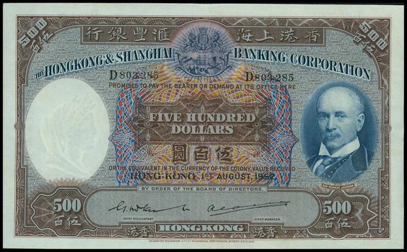 Hong Kong and Shanghai Banking Corporation, $500, 1 August 1952, serial number D 803285, brown and multicoloured, Sir Thomas Jackson at right, arms at top centre, reverse blue, old bank building at centre, woman at left,