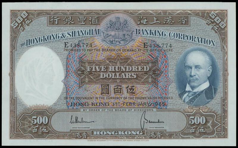 Hong Kong and Shanghai Banking Corporation, $500, 1 February 1965, serial number E 438774, brown and multicoloured, Sir Thomas Jackson at right, arms at top centre, reverse blue, old bank building at centre, woman at left,