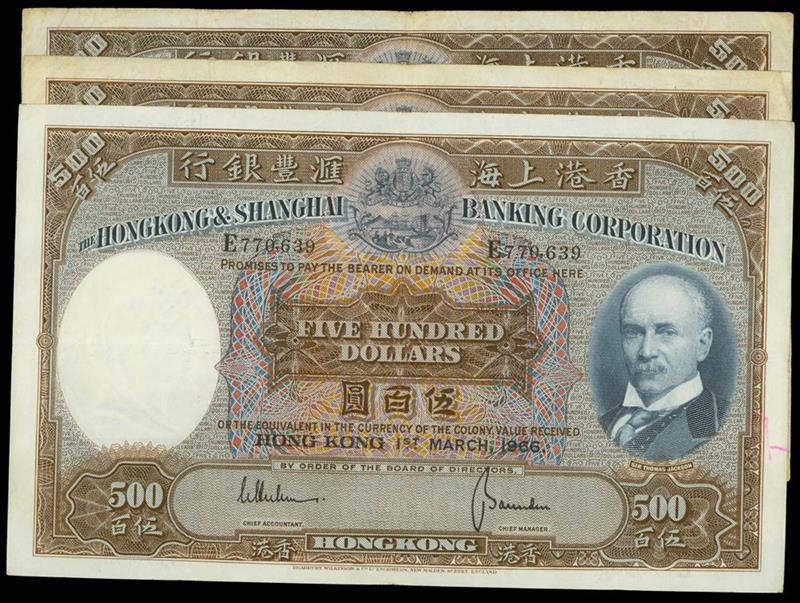 Hong Kong and Shanghai Banking Corporation, $500, a lot of 3 notes, 1 March 1966, 31 July 1967 and 11 February 1968, similar design, brown and multicoloured, Sir Thomas Jackson at right, arms at top centre, reverse blue, old bank building at centre, woman at left,