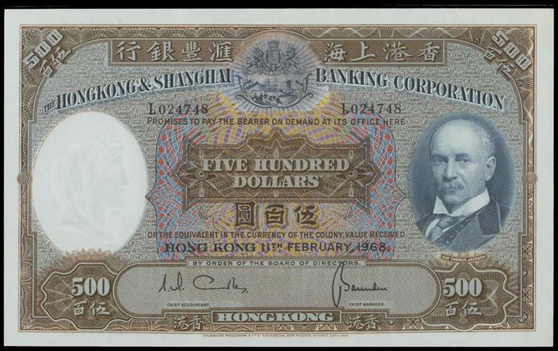 The HongKong and Shanghai Banking Corporation, $500, 1968, serial number L024748, brown, blue and multicoloured, Sir Thomas Jackson at right, coat of arms top centre, watermark of a woman in classical style at left, reverse blue, bust of woman at left and old HSBC building at centre,