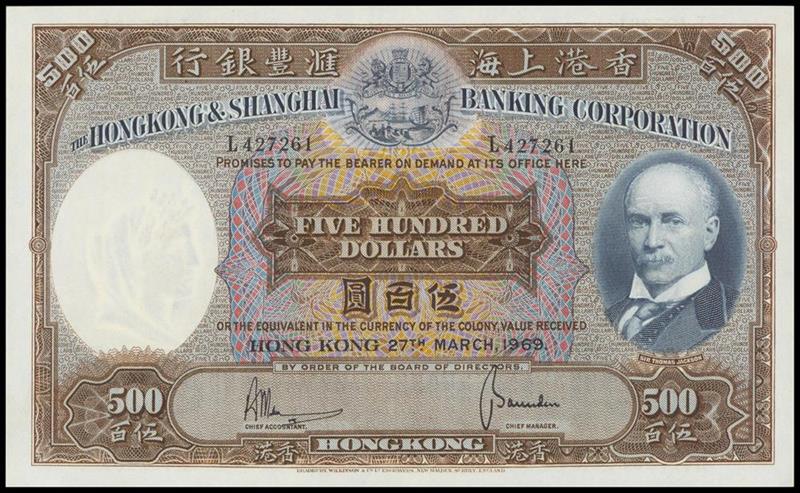 The HongKong and Shanghai Banking Corporation, $500, 1969, L427261, brown, blue and multicoloured, Sir Thomas Jackson at right, coat of arms top centre, watermark of a woman in classical style at left, reverse blue, bust of woman at left and old HSBC building at centre,