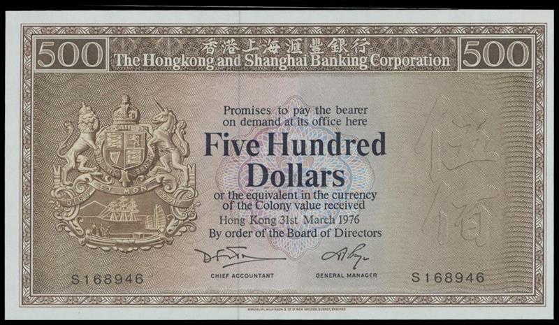 The HongKong and Shanghai Banking Corporation, $500, 1979, serial number S168946, brown and multicoloured, vignette at centre, coat of arms at right, 'Five Hundred' in Chinese characters, watermark of a lion, reverse brown, lion facing the HSBC building,