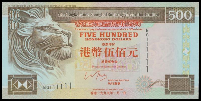 Hong Kong and Shanghai Banking Corporation, $500, 1999, solid serial number BG 111111, brown and multicoloured, lion at left, watermark at right, reverse brown and multicoloured underprint, two lions flanking bank building at centre,