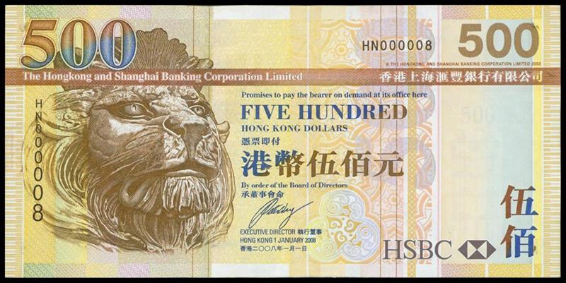 The HongKong and Shanghai Banking Corporation, $500, 2008, lucky serial number HN000008, brown and multicoloured, lion at left, reverse brown, Chek Lap Kok airport,