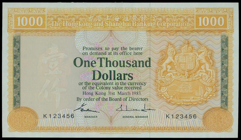 Hong Kong & Shanghai Banking Corporation, $1000, 31 March 1983, ascending ladder serial number K 123456, gold on multicoloured underprint, arms at right, reverse gold and pale blue, lion at left,