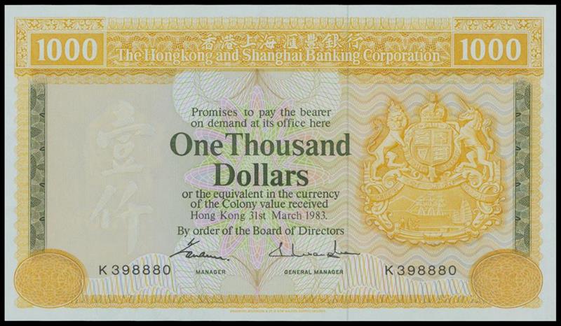 The HongKong and Shanghai Banking Corporation, $1000, 1983, serial number K398880, yellow-orange, coat of arms at right, lion watermark at left, reverse grey and orange, roaring lion at left, HSBC building right of centre,