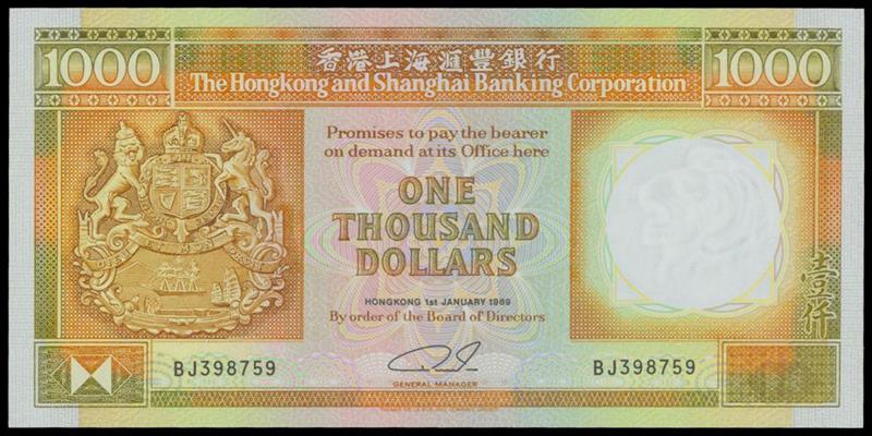 The HongKong and Shanghai Banking Corporation, $1000, 1989, serial number BJ398759, gold-yellow and multicoloured, bank crest at left, lion watermark at right, reverse shows the HSBC building and bronze lions,