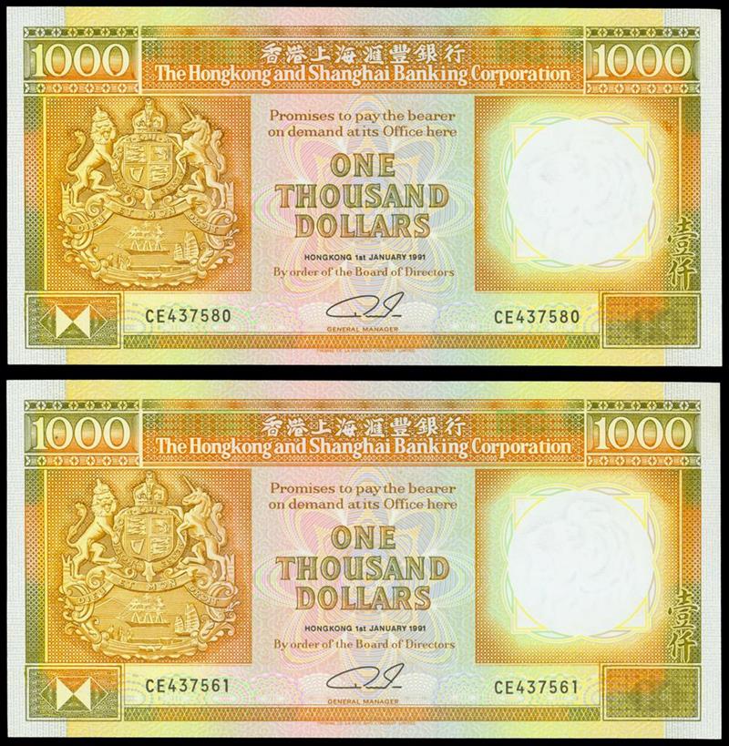 The HongKong and Shanghai Banking Corporation, pair of 2x $1000, 1991, serial numbers CE437561 and 580, red, brown and orange on multicoloured underprint, arms at left, watermark at right, reverse shows the HSBC building at centre, Supreme Court at right,