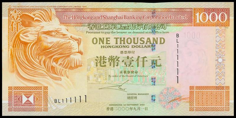 The HongKong and Shanghai Banking Corporation, $1000, 2000, lucky serial number BL111111, yellow-orange on multicoloured underprint, profile of a lion at left, view of Hong Kong Island at centre,
