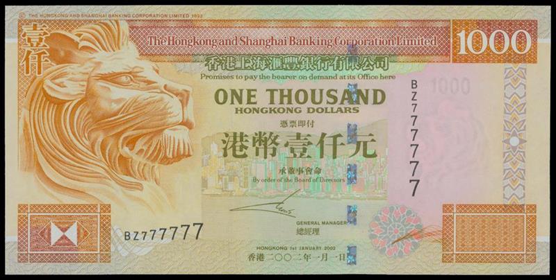 The HongKong and Shanghai Banking Corporation, $1000, 2002, lucky serial number BZ777777, yellow-orange on multicoloured underprint, profile of a lion at left, view of Hong Kong Island at centre,