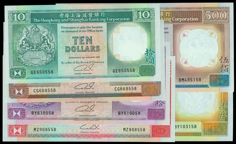 Hong Kong & Shanghai Banking Corporation, a set of $10, $20, $50, $100, $500 and $1000, 1991, green, orange-gray, purple, brown and orange-green respectively,