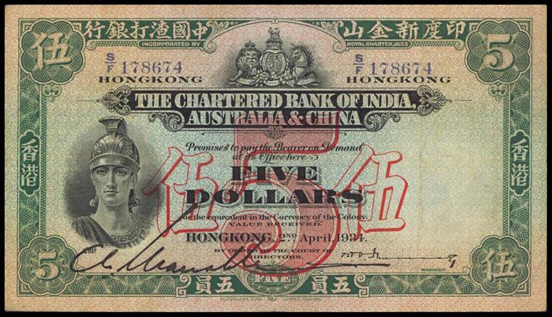 Chartered Bank of India, Australia and China, $5, 2 April 1934, serial number S/F 178674, green and pink, helmeted male head at left, arms top centre, value in red underprint at low centre, manuscript signature low left, printed signature low right, reverse green, boats and value